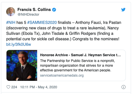 Dr. Anthony Fauci, director of the National Institute of Allergy and Infectious Diseases, and a 2020 Sammies finalist, shared a thank you message on Twitter to all public servants working in health care, especially those on the front lines fighting the coronavirus pandemic.