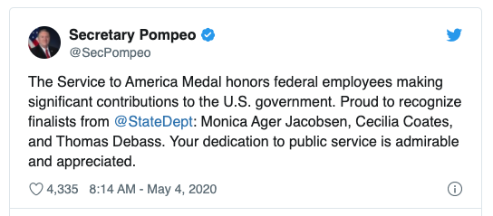 Federal leaders gave special shoutouts to employees in their agencies who are finalists for a 2020 Service to America Medals after the Partnership announced the 27 “Sammies” finalists the first week of May.