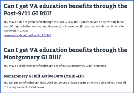 Selected webpages that describe eligibility criteria for receiving VA education benefits and provide tools for understanding what benefits are available received an A- in our analysis.
