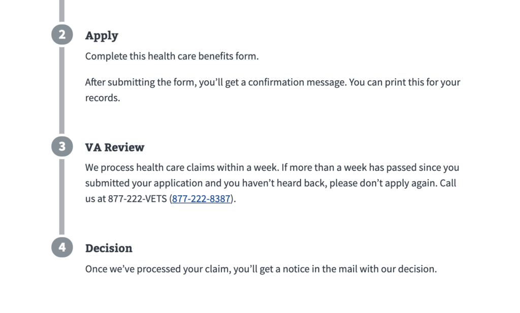 The web pages are clear and well-focused on the task of applying for VA health care benefits. The content is concise and provides the information needed to complete the task. It anticipates potential questions about the health care application process, such as next steps after applying and the length of time it could take for the VA to make a decision, and provides a phone number for questions about application status. The pages use plain language and a simple, spare design that conveys the process will be simple and straightforward. For veterans in crisis, there is a prominently displayed red alert bar notifying users that a Veterans Crisis Line is available 24 hours a day.