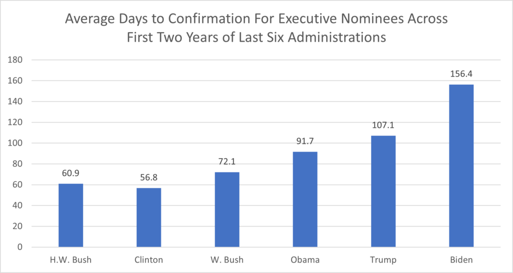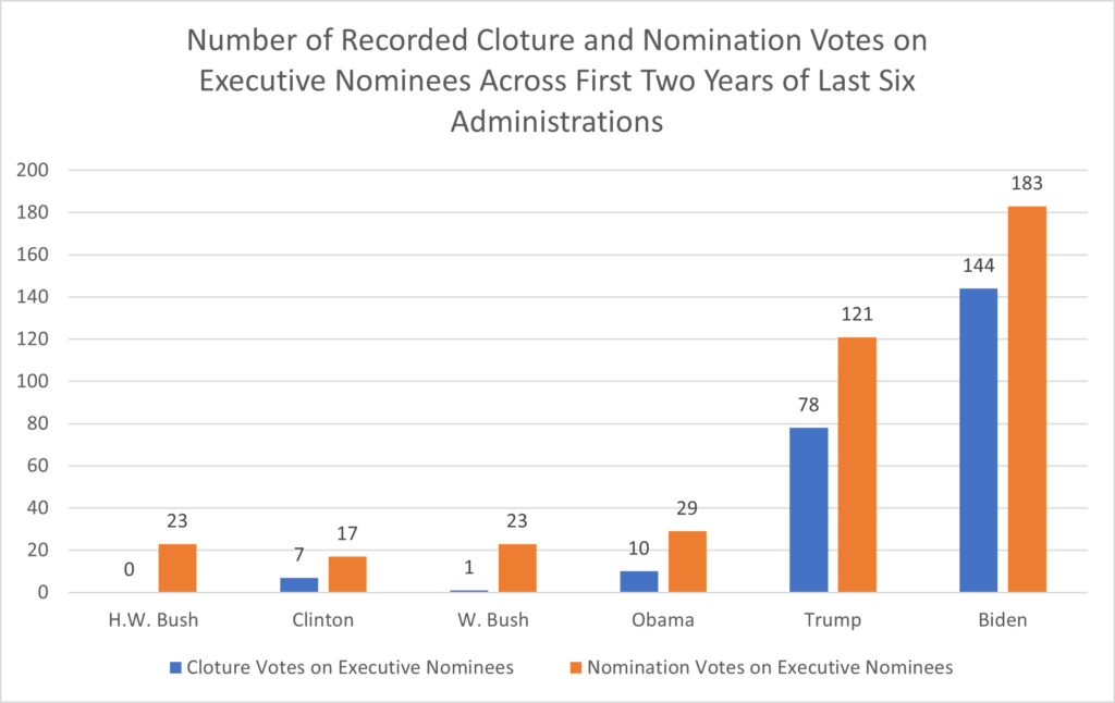 There were 40 or fewer combined cloture and nomination votes on executive nominees during the first two years of the Obama, George W. Bush, Clinton and George H.W. Bush administrations. During the Trump administration, there were 78 cloture votes on executive nominees alone, with an additional 121 votes on nominations. Those numbers continued to rise during the first two years of the Biden presidency, with 144 cloture votes and 183 nomination votes on executive nominees. The rise in cloture and nomination votes symbolizes the breakdown in the confirmation process, as more and more nominees cannot be confirmed without two rounds of recorded votes to end debate and for final consideration. Therefore, the Senate must devote increasingly more time to process each individual nominee.