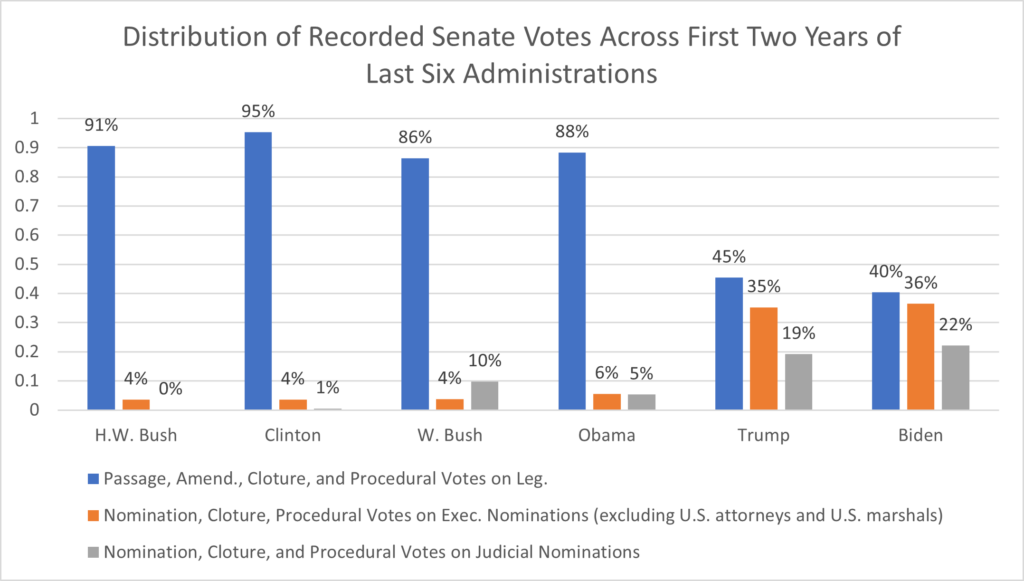 Votes on executive nominations made up 6% or less of Senate-recorded votes during the first two years of the every administration from George H.W. Bush to Obama. That percentage has ballooned to over 35% during Trump and Biden’s first two years in office. While votes on judicial nominees have increased to approximately 20% for Trump and Biden, that growth has not been as stark as it has been for executive nominees.