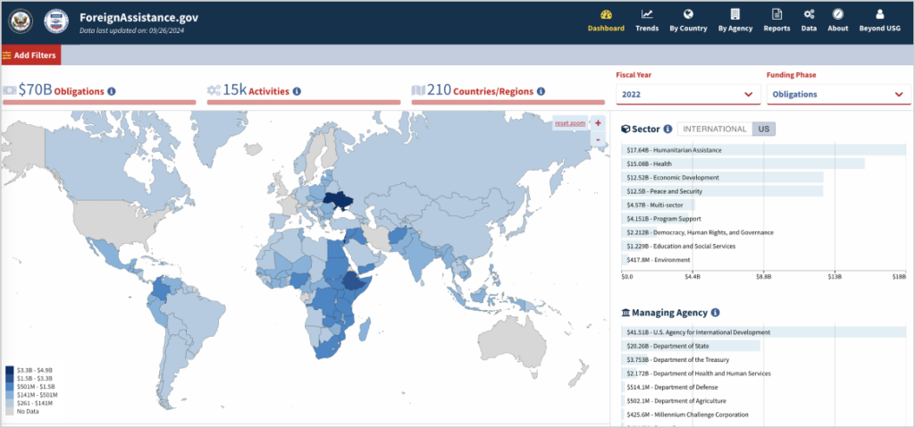ForeignAssistance.gov is the government’s flagship product for making U.S. foreign assistance data available to the public. Through an interactive dashboard and data visualizations, ForeignAssistance.gov reveals the scale, targeted sectors, and agencies managing U.S. aid programs that aim to foster global development, support humanitarian efforts and advance U.S. foreign policy objectives. Regardless of changes in the scope of foreign assistance, this tool has offered important insights to government leaders and the public about how those aid dollars are deployed.