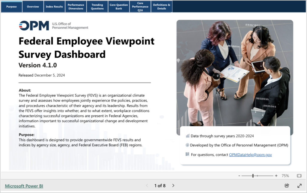 The Federal Employee Viewpoint Survey measures civil servants’ perceptions of the policies, practices and procedures of their agency and its leadership. Agency leaders and policymakers use this data to build better workplace cultures, improve the federal employee experience and enhance organizational performance. OPM created the FEVS Dashboard to provide federal officials and the public with government-wide results and index scores by agency size, agency and Federal Executive Board region. [Note: The Partnership for Public Service relies on the annual Office of Personnel Management survey data to produce its Best Places to Work in the Federal Government® rankings.