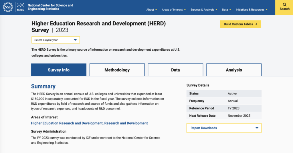 The Higher Education Research and Development survey tracks U.S. higher education institutions’ annual expenditures on research and development. This data is crucial for evaluating trends in academic R&D funding, supporting policy decisions, and analyzing the role of universities in innovation and economic growth.