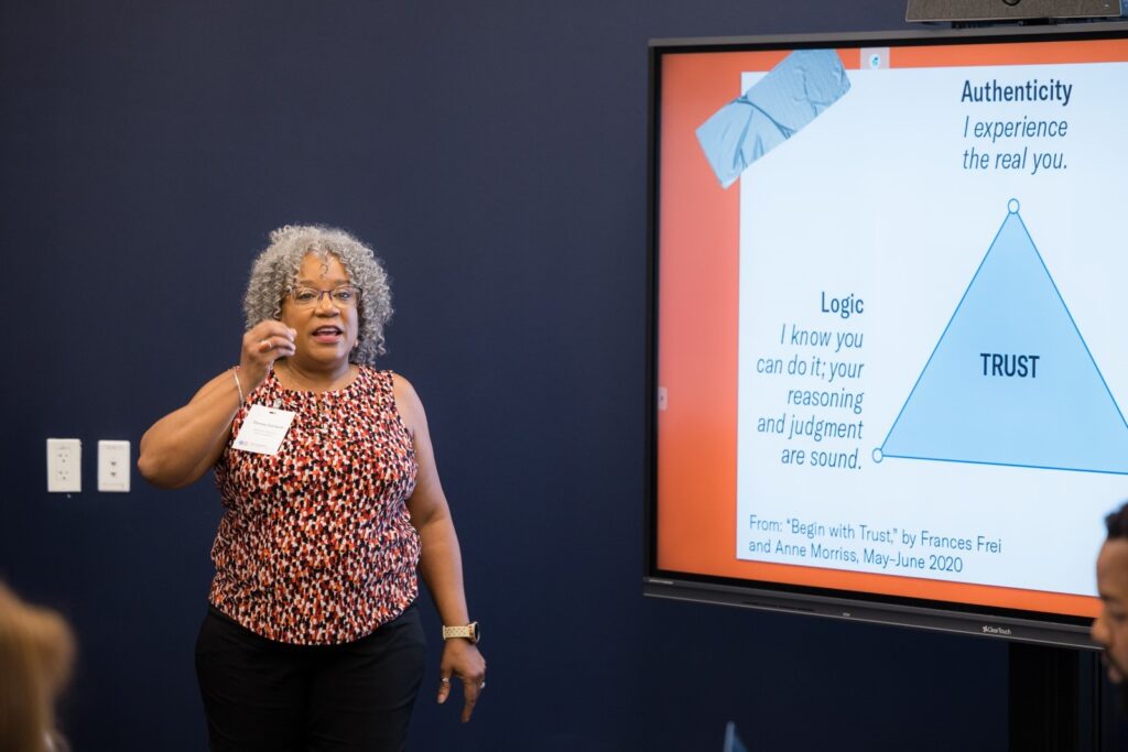 Focusing on the social science theories behind trust, she shared how the triangle of authenticity, logic and empathy can guide agency communications.