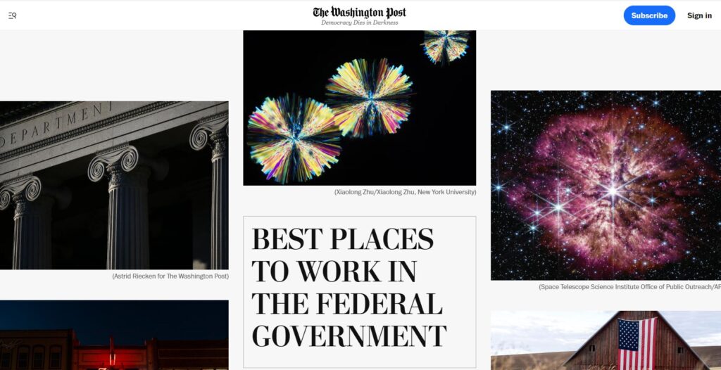The Washington Post also published a special preview of the rankings that features the top 10 federal workplaces in four categories: large, midsize and small agencies, and agency subcomponents. The preview included companion pieces in the Post’s business section on how to find federal jobs and internships, the presidential transition process and more, bringing the rankings—and the critical issue of employee engagement and satisfaction in government—to a national audience.