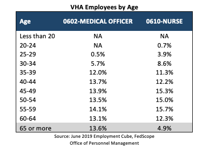 According to the Centers for Disease Control and Prevention, adults 65 years and older are at the highest risk of severe illness from the coronavirus. About 14% of VHA medical officers fit that category. Additionally, almost 13% of medical officers and 12% of nurses are between 60 and 64 years of age.